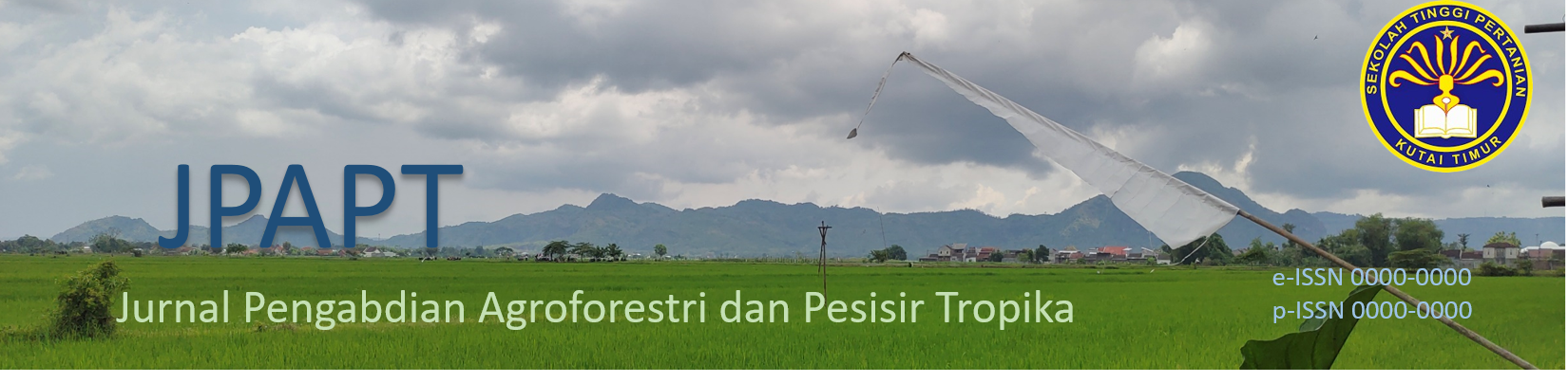 Jurnal Pengabdian Agroforestri dan Pesisir Tropika (JPAPT) adalah jurnal ilmiah yang diterbitkan oleh Sekolah Tinggi Pertanian Kutai Timur, Kabupaten Kutai Timur. Jurnal ini mempublikasikan hasil kegiatan Pengabdian kepada Masyarakat (PkM) yang berfokus pada pengembangan dan penerapan ilmu pengetahuan, teknologi, dan inovasi di bidang pertanian tropika, meliputi pertanian, peternakan, perikanan–kelautan, dan kehutanan, khususnya pada ekosistem agroforestri dan wilayah pesisir.